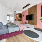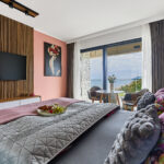 Wnętrze apartamentu urzeka elegancją i dbałością o każdy detal. Przestronny pokój, utrzymany w perfekcyjnie dobranej kolorystyce, tworzy atmosferę harmonii i spokoju. Znajduje się tu wyjątkowo wygodne łóżko typu king size (160×200 cm) oraz pojemna szafa, która podkreśla funkcjonalny, a zarazem luksusowy charakter przestrzeni.